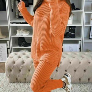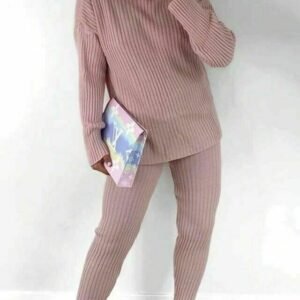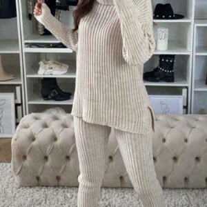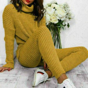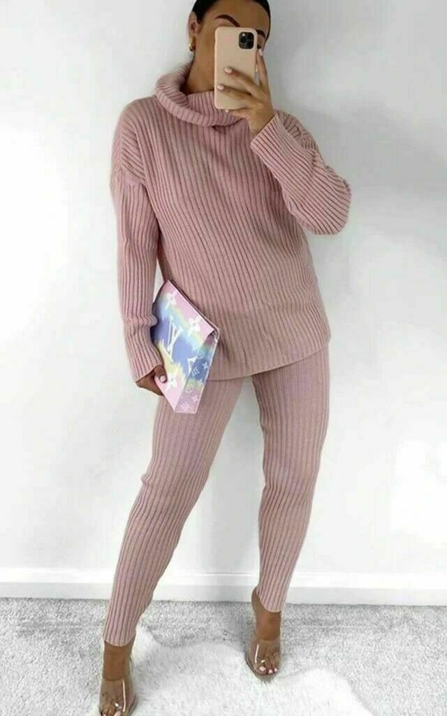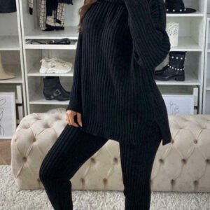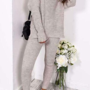 This stylish Loungewear Set is perfect for a cozy day indoors. The Ladies Chunky Knitted Ribbed Polo High Neck Top and Leggings combine comfort and fashion, made of super soft knitted fabric. Great for relaxing days at home or running errands.